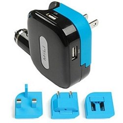 MiLi 2.1A Universal Charger 4-plug VersionKeep youriPhone, iPad and other mobile devices juiced up on the road or at home with this uniquely designed car and wall in one charger. With half the size ofa mouse, it has enough power (2.1A) to charge up your iPad quickly. Going abroad? Get the worldwidepackage that features US, UK, EU and AU plugs, and remain connected at all times. Features:* Folding car charger with Removable UK/EU/US/ AUWorldwide adaptors.* Can charge two different device simultaneously by two USB output.* Compatible with USB 2.0 based mobile phones/digital cameras/mp3/etc.* AC/DC input,with 2 USB output ports, charge two different devices simultaneously.* Includes US, UK, EU AU plugs